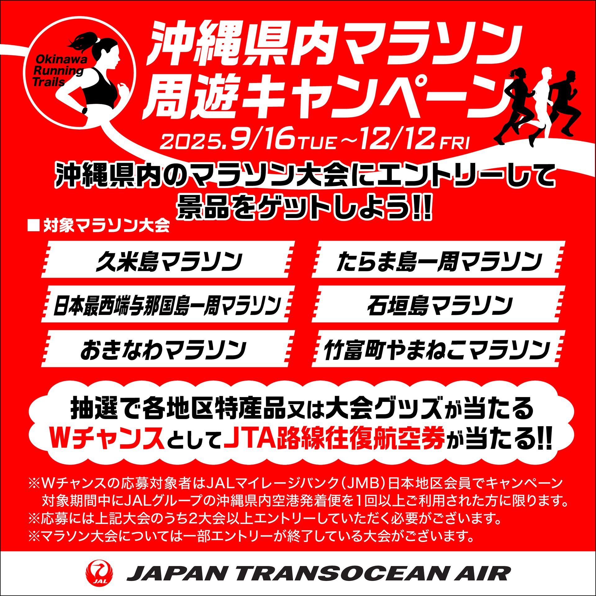 - 以下のキャンペーン対象大会のうち2大会にエントリーすると抽選でプレゼントが当たる「沖縄県内マラソン周遊キャンペーン」を実施しています。